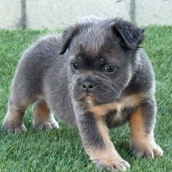 Trkey is a Blue Tri fluffy EnglishBulldog with a great, loving personality. Delivered anywhere in the US for around $650