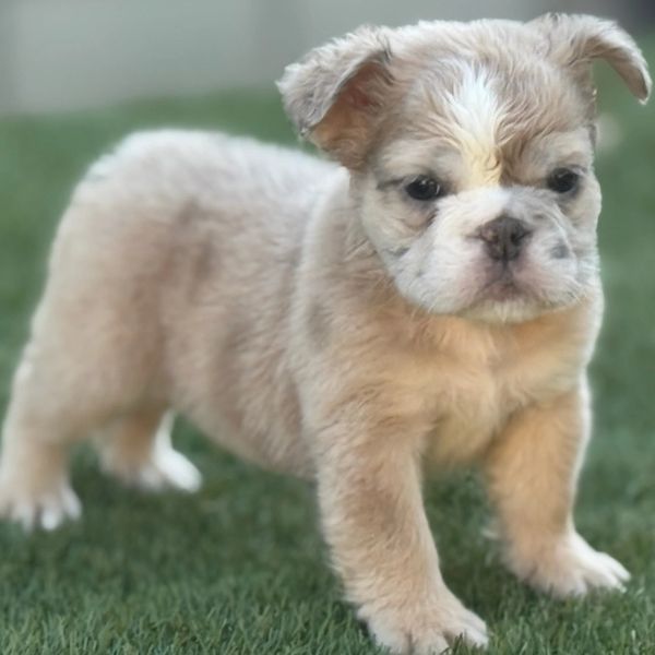 Little fluff is a blue merle fluffy English bulldog boy. Delivered anywhere in the US for around $650.