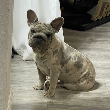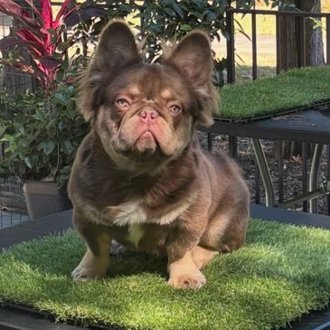 Big Fluff is rare short compact fluffy English Bulldog. He carries two copies of blue and one copy of chocolate.